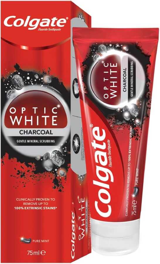 Ürün Açıklaması: Aktif kömür içeren Colgate Optic White Charcoal Diş Macunu, diş yüzeyindeki lekeleri nazikçe temizleyerek beyazlatıcı etki sağlar, diş minesine zarar vermeden günlük kullanım için uygundur, ferahlatıcı nane aromasıyla ağızda temizlik ve tazelik hissi bırakır.