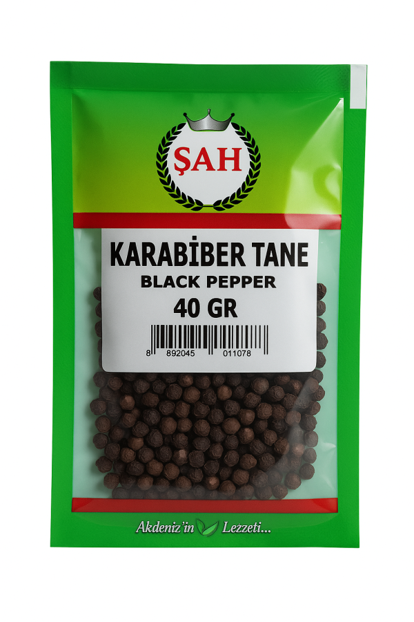 Ürün Açıklaması Şah Bütün Karabiber 40 gr, karabiber bitkisinin olgunlaşmamış ve kurutulmuş tanelerinden elde edilen doğal bir baharattır. Keskin ve yakıcı aromasıyla yemeklere derinlik ve karakter kazandırır. Özellikle et, sebze, çorba ve sos tariflerinde taze çekilerek kullanıldığında lezzet etkisi artar.